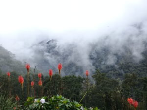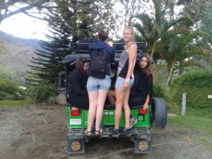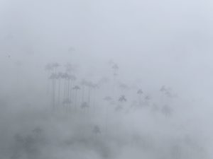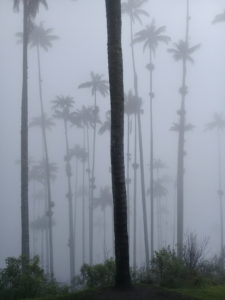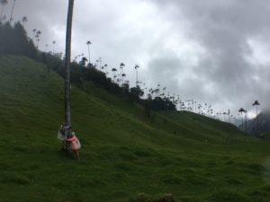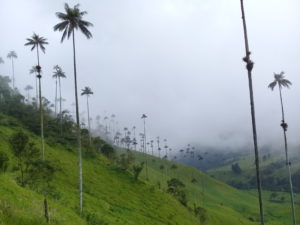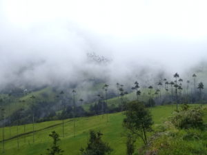 Wir wollen gerade aufbrechen da fängt es richtig fest an zu regnen. Es scheint nicht gerade wieder aufzuhören, also ziehen wir unsere Ponchos an und laufen los. Der steile, schmale Weg, welchen wir steil hinauf gelaufen sind hat sich in einen Fluss verwandelt. Wir mussten uns an Baum und Stein festhalten um nicht um zufallen. Zwischendurch musste man springen und einfach hoffen, dass man an einem nicht allzu schliefrigen Ort landet. Der Regen will nicht nachlassen und wir wanderten stundenlange durch den nassen Nebel. Ich glaube wir waren direkt in einer Wolke. Wir dachten schon wir seien verloren gegangen, als wir endlich eine Riesenpalme sahen. Dann zwei und dann ganz viele. Ich war zuerst endtäuscht, dass es so neblig war, doch dann realisierte ich, dass das ganze mit Nebel noch viel viel Besser aussieht. Mystisch, siehe Fotos. Nach mindestens 6 Stunden kamen wir völlig durchnässt am Ausgang an und zwängten uns in einen Jeep. Doch dieser wollte nicht losfahren. Trotz Regen mussten sich zwei hinten drauf stellen. Schlussendlich waren wir 12 Personen und ein Hund in und auf dem Jeep (Armer Hund musste auf dem Dach sein – leider kein Foto).
