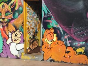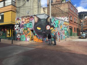 Es war eine riesige Gruppe. Bestimmt 20 Leute liefen hinter einem Guide her. Wir verstanden nicht viel und waren zu müde um uns richtig zu konzentrieren. Die Tour dauerte 2.5h. Etwas zu lange. Trotzdem hielten wir durch. Was der Guide erzählte war spannend. Jedes Graffiti hat eine Geschichte und will etwas sagen, meist politisch. Viele Graffitis sind auch von europäischen Künstlern. In Kolumbien ist das ansprayen von Wänden verboten, doch nicht illegal, was heisst du kannst gebüsst werden jedoch keine Anzeige bekommen. Hallo Korruption. Ein weiteres Nebengeschäft für etwas Polizistentaschengeld.