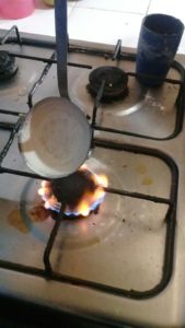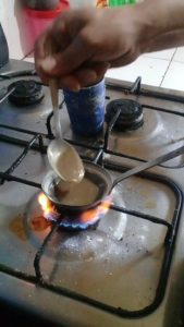 Nun gehts über den Herd. Es wird gekocht. Das Backpulver wird erhitzt und dann der Flüssigkeit zugefügt. Innerhalb von 10 Sekunden verschwindet der Benzingeschmack. Ich bin erstaunt. Nun wird die ganze Masse noch gekocht.  „Und dies mein Kind, dies ist Crack“. Ich schaute die braune Flüssigkeit mit grossen Augen an. So soll also Crack aussehen. Ich fragte, was er denn damit macht und er antwortet zu meinem Beruhigen, dass er dies weg wirft. Einige Touristen wollen dies jeweils mitnehmen, doch das gibt er nicht raus, das sei pures Gift und nur für den Abfluss. Nachdem die braune Flüssigkeit raus ist sieht man wie sich langsam weisse Masse am Rand des Pfännchen bildet. Weisse Masse auf Teller, Teller genau 1min unter die Küchenlampe und fertig ist das „pure“ (oder eben so gut wies geht) Kokain.